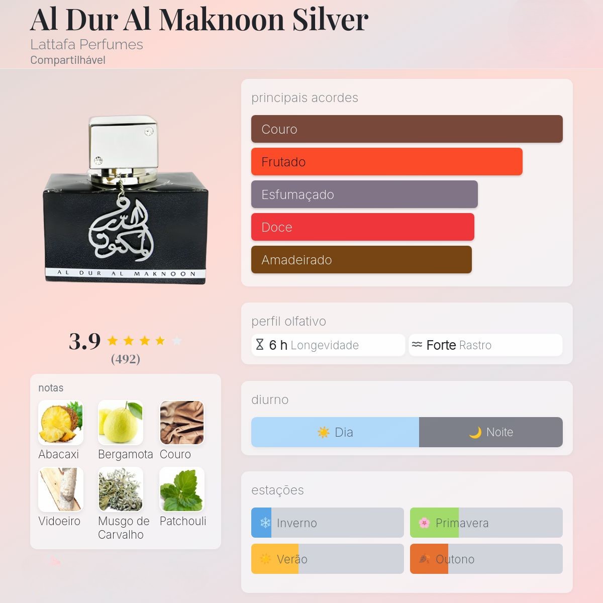 Al Dur Al Maknoon Silver de Lattafa Perfumes é um perfume Couro Compartilhável. As notas de topo são: Abacaxi, Bergamota e Maçã. As notas de coração são: Vidoeiro, Patchouli e Jasmim. As notas de fundo são: Couro, Musgo de Carvalho, Almíscar e Âmbar.