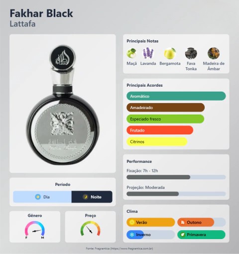 Fakhar Black de Lattafa Perfumes é um perfume Âmbar Masculino. Esta é uma nova fragrância. Fakhar Black foi lançada em 2022. As notas de topo são: Maçã, Bergamota e Gengibre. As notas de coração são: Lavanda, Sálvia, Bagas de Zimbro ou Junípero e Gerânio. As notas de fundo são: Fava Tonka, Madeira de Âmbar, Cedro e Vetiver.