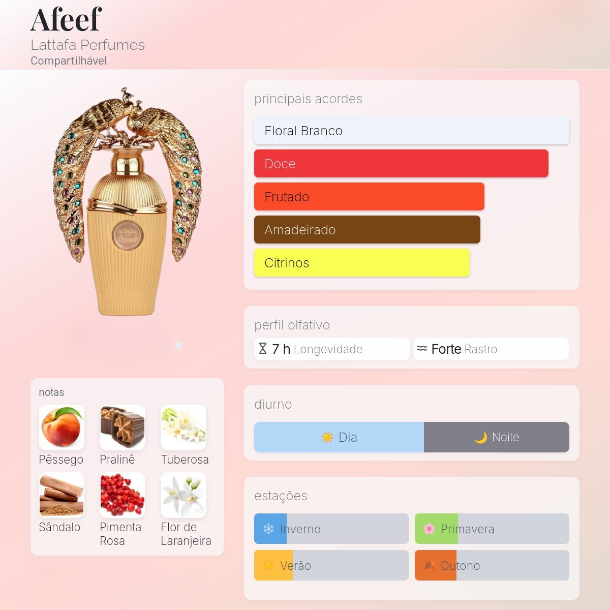 Afeef de Lattafa Perfumes é um perfume Compartilhável. Esta é uma nova fragrância. Afeef foi lançada em 2024. As notas de topo são: Pêssego, Pimenta Rosa e Bergamota. As notas de coração são: Tuberosa, Flor de Laranjeira e Jasmim. As notas de fundo são: Pralinê, Sândalo, Âmbar e Patchouli.