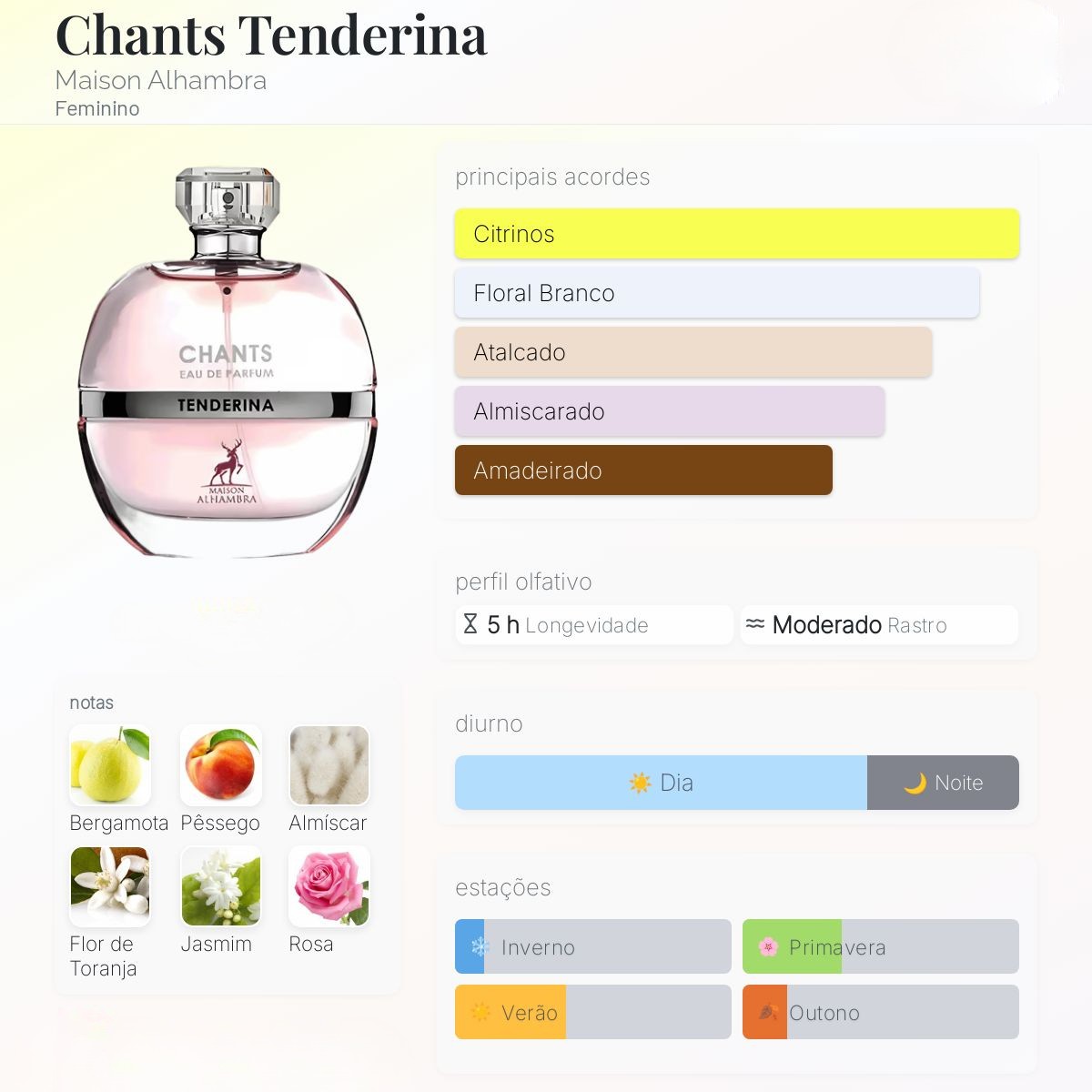 Chants Tenderina de Maison Alhambra é um perfume Floral Frutado Feminino. Chants Tenderina foi lançada em 2022. As notas de topo são: Bergamota, Flor de Toranja e Pêssego. As notas de coração são: Jasmim, Rosa e Íris. As notas de fundo são: Almíscar Branco, Vetiver, Baunilha e Patchouli.