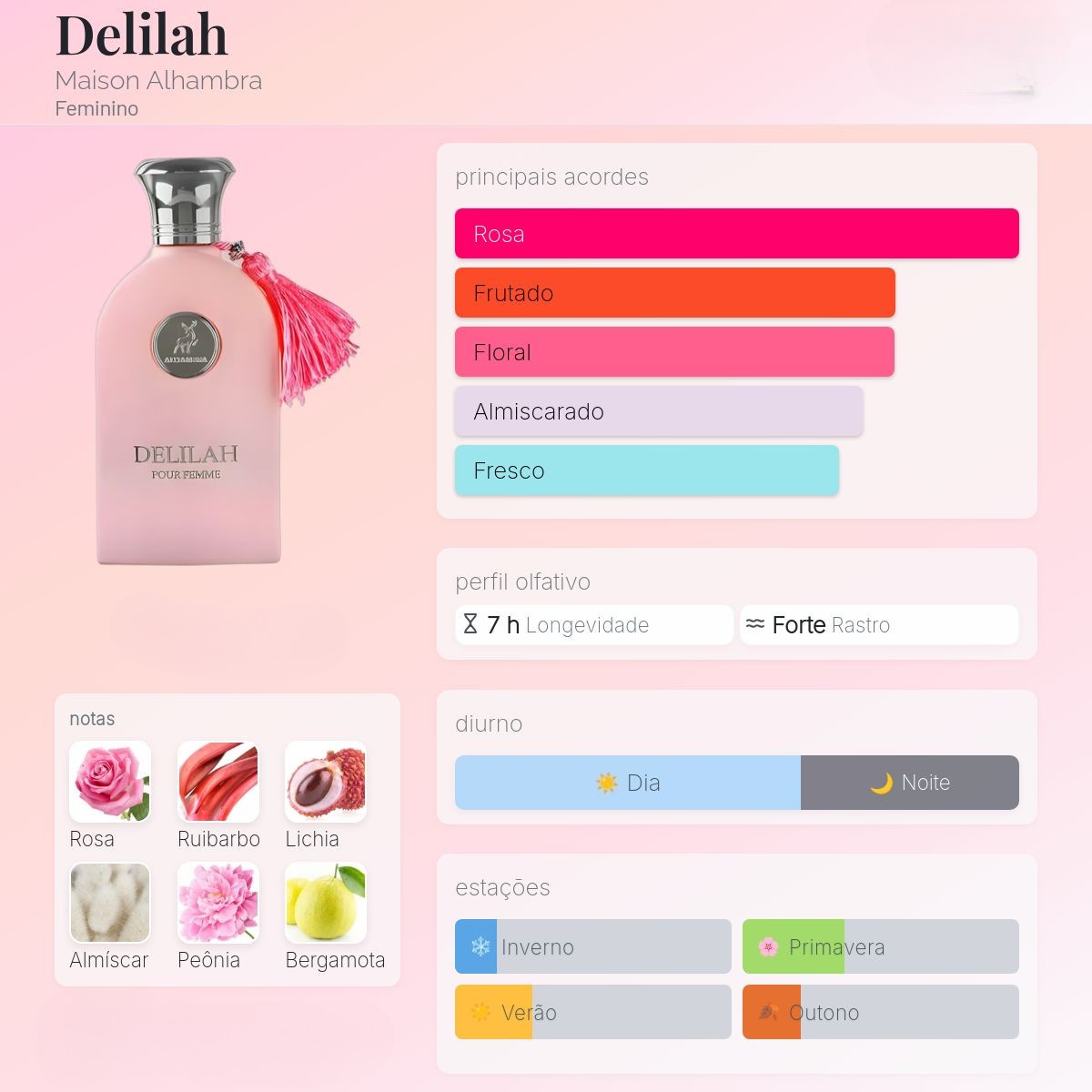 Delilah de Maison Alhambra é um perfume Floral Frutado Feminino. Delilah foi lançada em 2023. As notas de topo são: Ruibarbo, Lichia e Bergamota. As notas de coração são: Rosa Turca, Peônia e Lírio. As notas de fundo são: Almíscar Branco, Baunilha e Cashmeran.