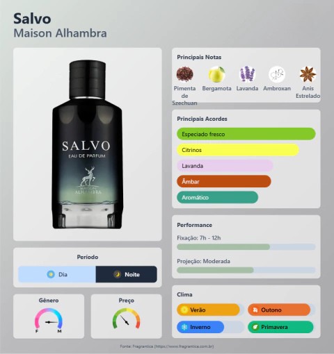 Salvo de Maison Alhambra é um perfume Oriental Fougére Masculino. Salvo foi lançada em 2022. A nota de topo é Bergamota. As notas de coração são: Lavanda, Pimenta de Szechuan, Anis Estrelado e Noz-moscada. As notas de fundo são: Ambroxan e Baunilha.