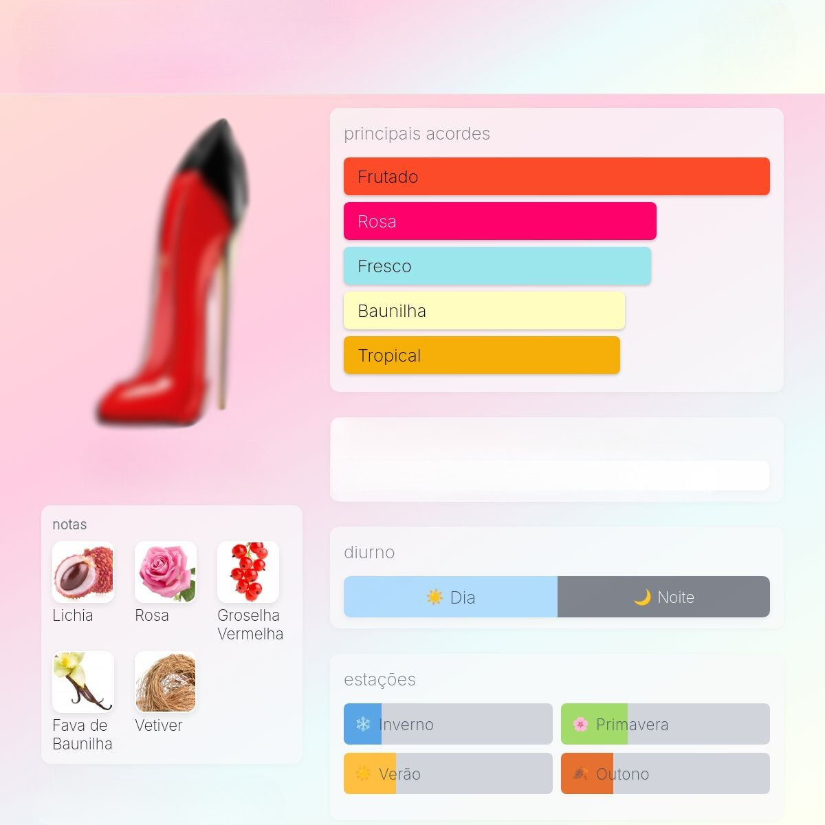 É um perfume Floral Frutado Feminino.As notas de topo são: Lichia e Groselha Vermelha. A nota de coração é: Rosa. As notas de fundo são: Baunilha e Vetiver.