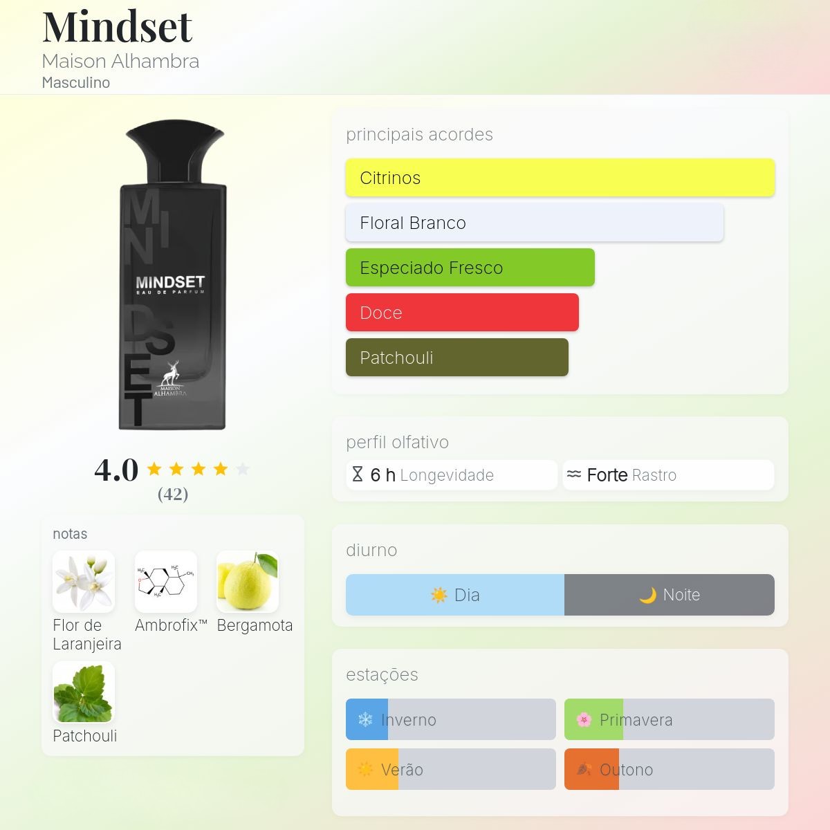 Abre cítrico e luminoso, evolui para um floral masculino elegante e finaliza com base amadeirada-almiscarada confortável—uma assinatura limpa, versátil e cheia de personalidade.